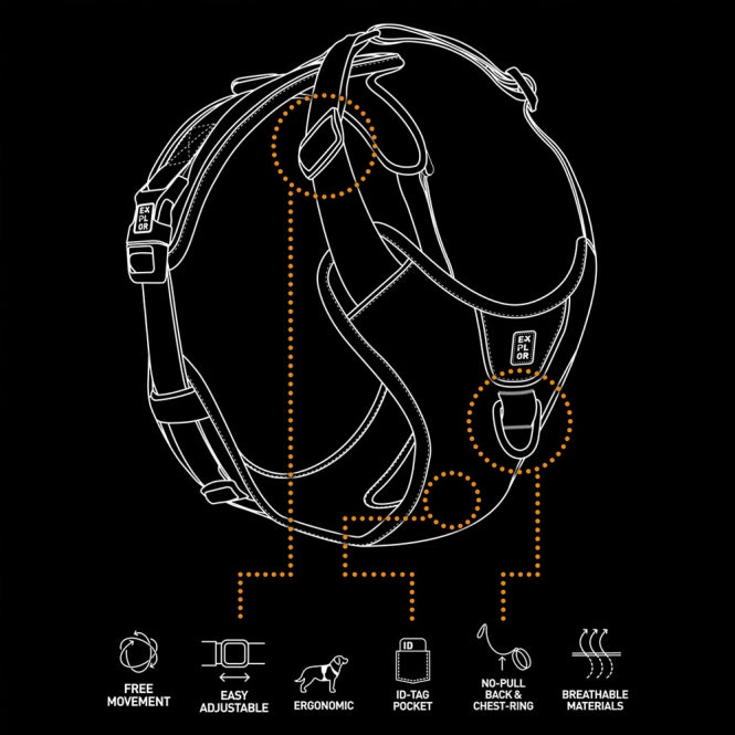 Het tuig heeft twee roestvrijstalen bevestigingsringen: één op de rug, die geschikt is voor rustige of oudere honden die gemakkelijk onder controle te houden zijn, en een versterkte D-ring in het borstgebied om honden die aan de riem trekken onder controle te houden. Het EXPLOR Ultimate Fit No-Pull harnas is verstelbaar rond de nek en de borst, wat het, in combinatie met de slijtvaste materialen, geschikt maakt voor bijna alle honden.