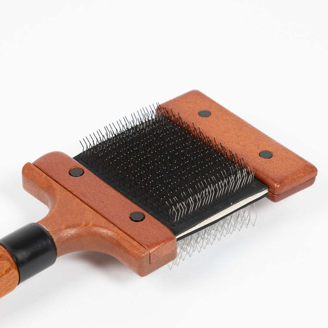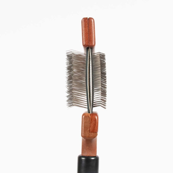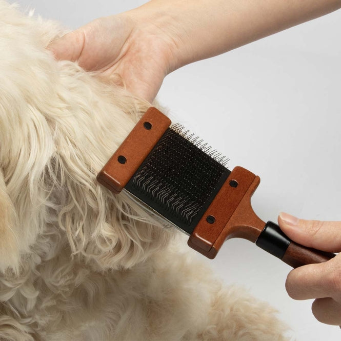 De Duo Slickerborstel van Noir Japandi heeft een flexibele borstelkop die zich moeiteloos vormt naar de vorm van het lichaam van je huisdier. De roestvrijstalen pinnen - kort aan de ene kant en langer aan de andere - verwijderen voorzichtig losse haren, vuil, klitten en dode ondervacht zonder de huid te irriteren. Geschikt voor alle vachttypes en ideaal voor langharige dieren. Voorzien van een ergonomische handgreep van FSC-gecertificeerd beukenhout met een donker gebeitste afwerking.