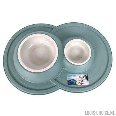 De Happy Pet Mad About Pets Voerbak/Drinkbak Volcano Dubbel Salie Groen 230/600 ml is een dubbele voer- en drinkbak met flexibele mat. De bakken zijn in de mat geïntegreerd, waardoor het geheel eruit ziet als een soort dubbele vulkaan. De binnen-bakjes van plastic zijn uit de mat te verwijderen, om het geheel goed schoon en droog te kunnen maken. De Volcano dubbele voer- en drinkbak van Happy Pet heeft een mooi ontwerp en is uitgevoerd in de kleur salie groen.
