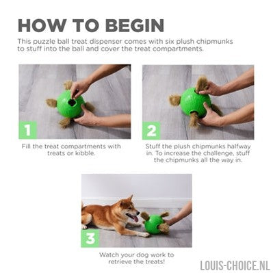 De Nina Ottosson Dog Snuffle N'Treat Bal Groen 16 cm is een interactieve puzzelbal en snackautomaat. Deze leuke bal bevat verschillende gaten waarin de snacks verstopt kunnen worden. Plaats daarna de pluche beestjes in de opening en zie hoe jouw hond spelenderwijs leert oplossingsgericht te denken om de beloningen te pakken te krijgen! De snacks komen tevoorschijn als jouw hond de pluche beestjes uit de bal krijgt en de bal rolt.