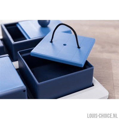 Verstop brokjes of snacks in de vier rode bakjes. De hond zal deze ruiken, maar zal verschillende technieken moeten toepassen om bij de brokjes of snacks te komen. De vier rode bakjes kunnen namelijk ieder op een andere manier geopend worden.
