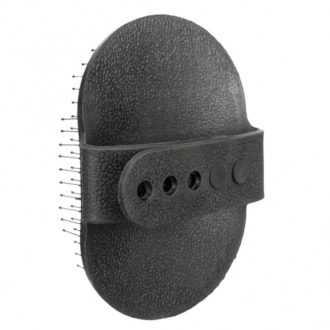 Deze groomeg is gemaakt van rubber en is uitgerust met een verstelbare handriem. De stalen pennen zijn roestvrij en aan de uiteinden voorzien van noppen.