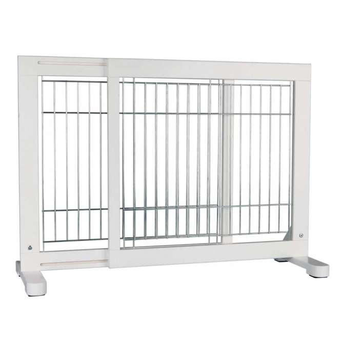 Dit hoogwaardige hondenhek is gemaakt van gelakt grenenhout met gegalvaniseerde spijlen en maakt het mogelijk om kamers, trappen enz. af te zetten voor kleine en middelgrote honden.