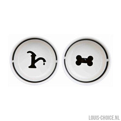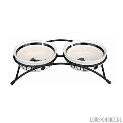 De Trixie Voerbak / Drinkbak Set Eat On Your Feet wit /zwart 2 x 0,6 l / 15 cm bestaat uit twee keramische bakken in slipvaste metalen standaard. Deze set is niet alleen handig, maar staat ook nog eens leuk in jouw interieur. De set bestaat uit twee witte bakken met zwarte accenten: de ene voerbak heeft aan de zijkant een opdruk ‘water’ en de andere ‘food’, met een corresponderende afbeelding op de bodem, namelijk een botje en een kraantje. Aan de binnenkant loopt een zwarte rand, die mooi aansluit bij de vorm van de zwarte, metalen houder. Deze is gebogen voor een sjieke uitstraling en voorzien van slipvaste rubberen voetjes. Zo kan jouw dier in alle rust eten zonder dat de bakken heen en weer schuiven.